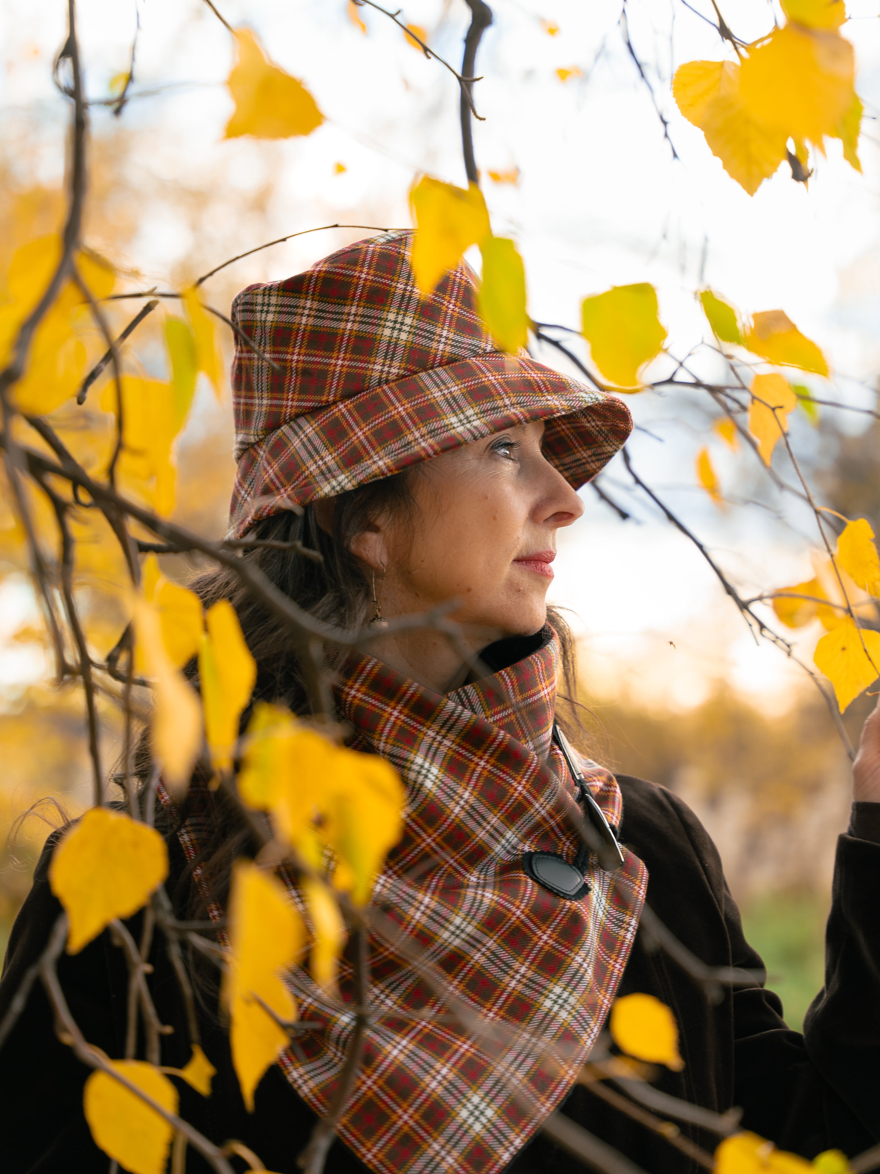The cowl is a roomier fit than our neck warmer. It's several inches longer and wider, giving a generous fit yet still warm and stylish. It, too, is 100% wool tartan and lined with a luxe fleece, secured with a toggle.