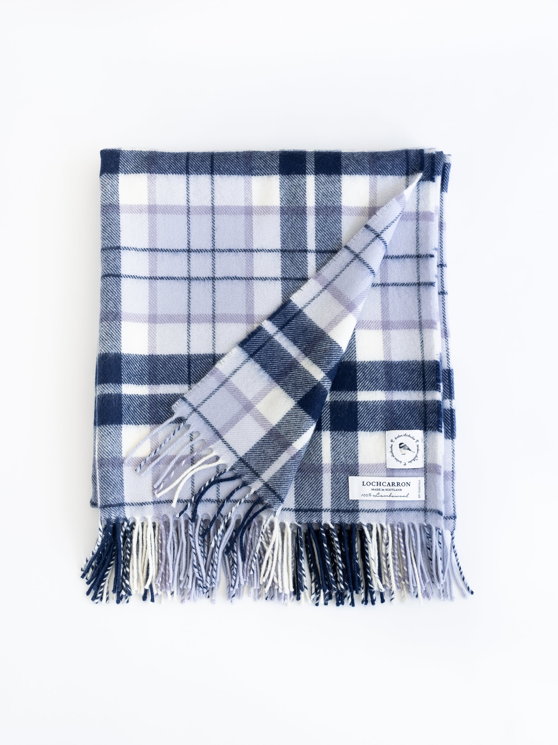 Our luxurious Arctic BlueBerry lambswool blanket is a Tartan Chickadee® exclusive! Gray, navy, white, and lavender the colors of Alaska during blueberry season. Use it as a home accent and bring a little bit of Alaska and Scottish charm to your life. Made in Scotland of 100% lambswool, this lap blanket makes a stylish addition to your home or a thoughtful gift. The warm and durable blanket will stand the test of car trips, picnics, and cozy couch time.