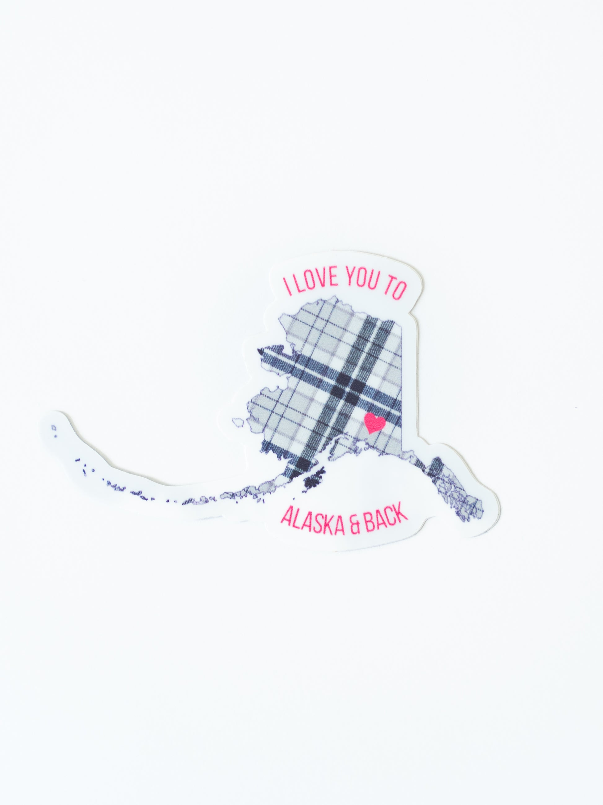 Our custom-designed sticker is in the shape of Alaska and features the exclusive Arctic Blueberry Tartan pattern. The sticker also includes the heartfelt phrase, "I love you to Alaska and back." It's a unique and thoughtful way to show your affection for someone special.
