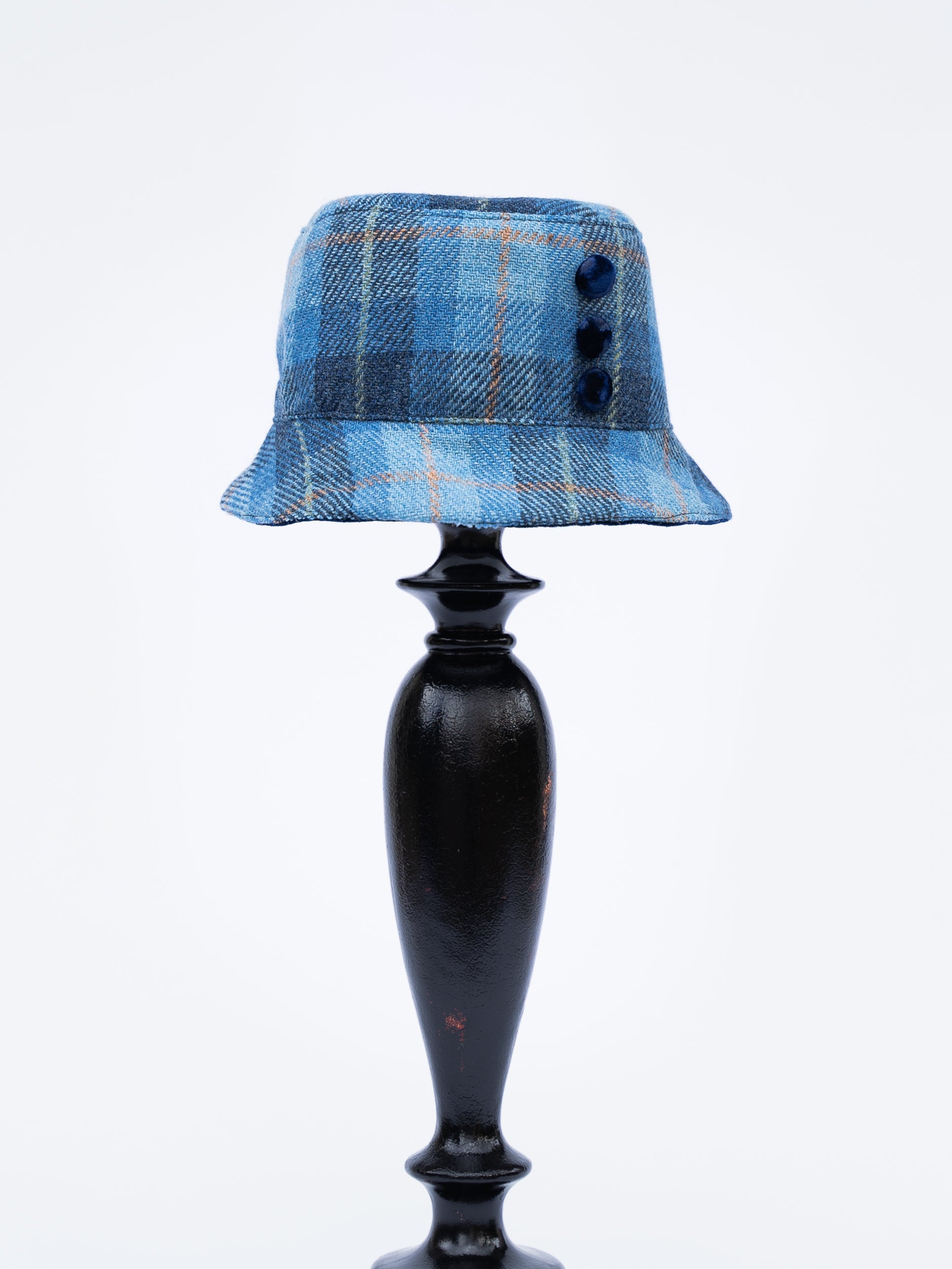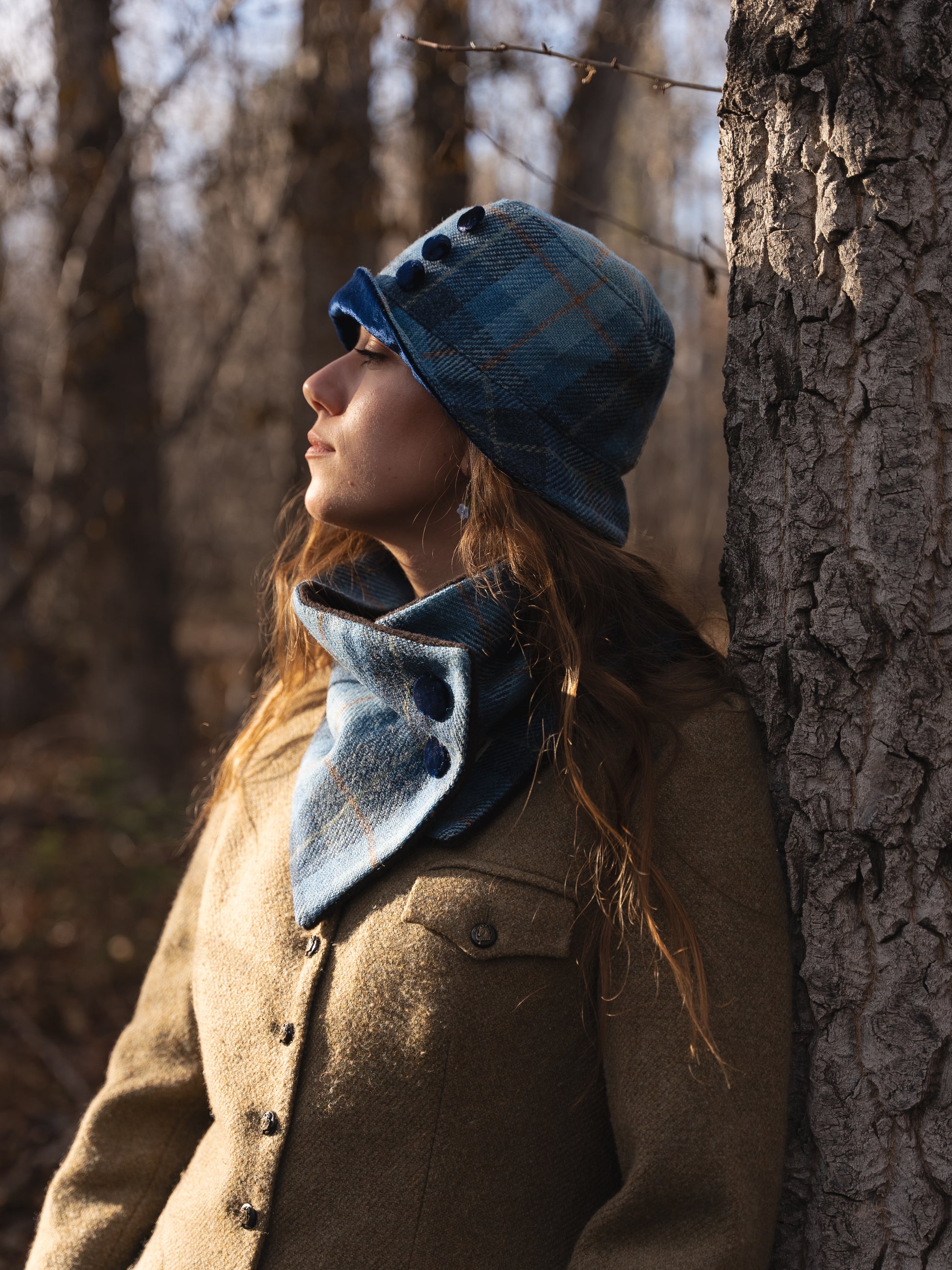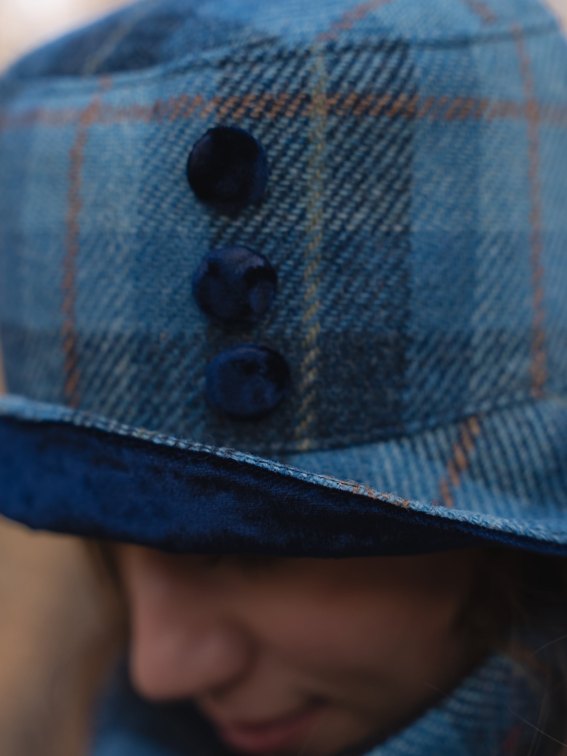 This beautiful  Harris Tweed® hat evokes the tranquility of blue skies, featuring a striking blend of three shades of blue and gold tartan. The interior is lined with soft cotton, ensuring maximum comfort. Decorated with handcrafted blue velvet buttons, it offers an elegant flair.   Harris Tweed® is skillfully handwoven by artisans in the Outer Hebrides of Scotland. Every hat is meticulously designed and sewn in Alaska. With limited quantities available, this distinctive accessory marries classic craftsmanship with Alaskan practicality.