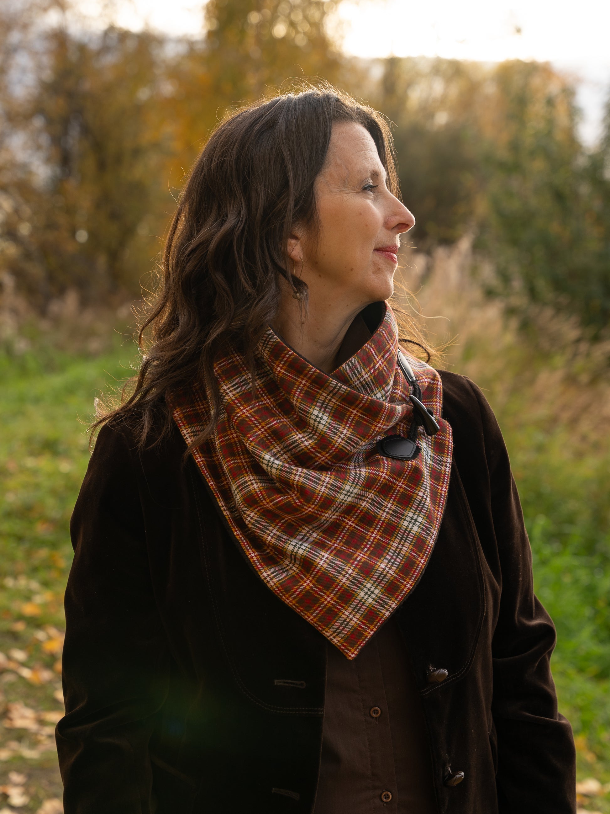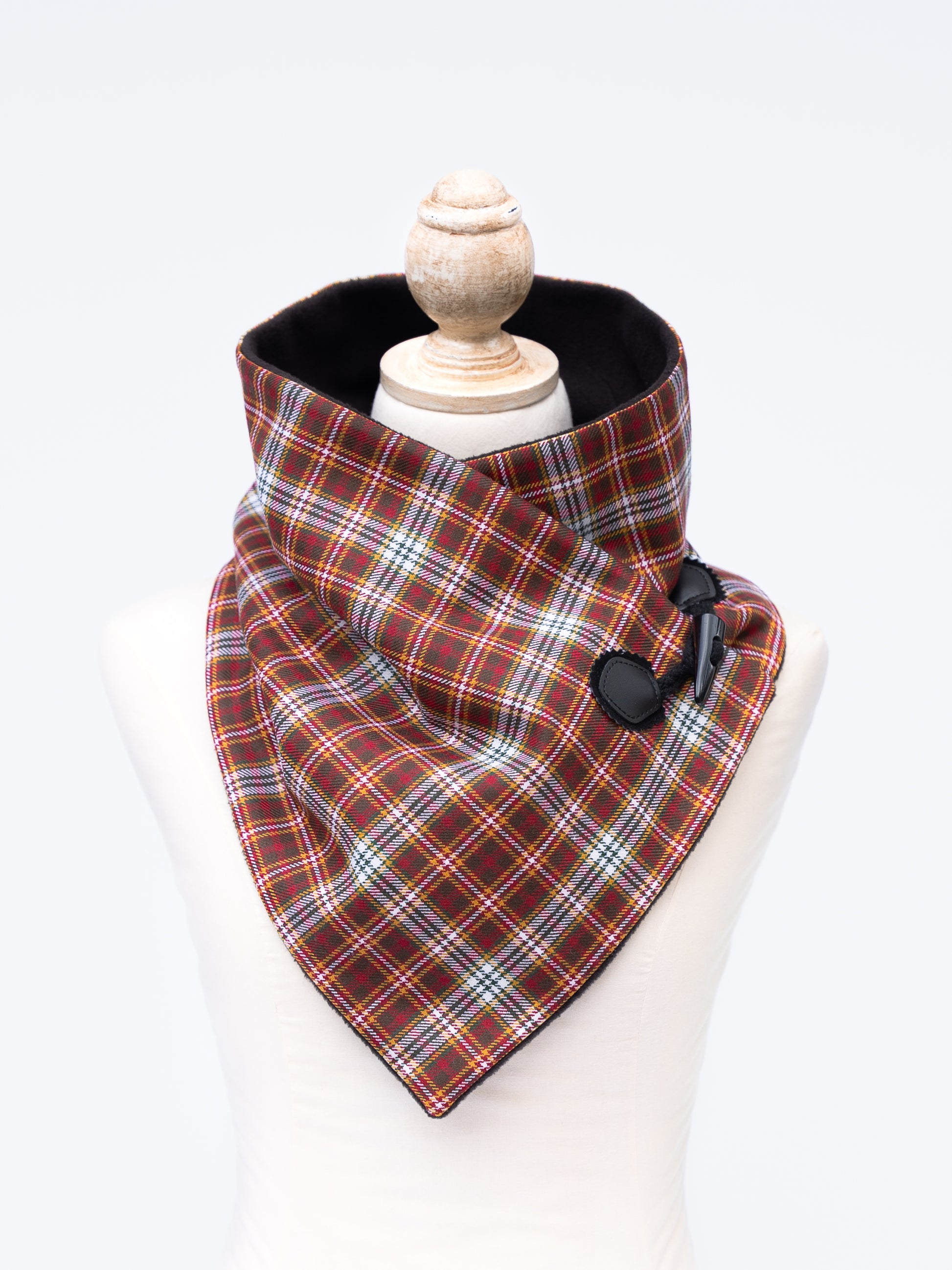 The Tundra Twilight Tartan Neck Cowl is an exquisite accessory exclusively available at Tartan Chickadee®. Handcrafted with care, this neck cowl features our exclusive Tundra Twilight tartan, inspired by Alaska's stunning autumn landscapes. The fine tartan exterior is lined with soft, non-pil luxe fleece for ultimate comfort and warmth. It is designed as a sophisticated alternative to the cumbersome scarf, so it closes securely with a snap and a stylish faux black horn toggle. Elevate your fall and winter wardrobe with this elegant, handmade neck cowl, blending timeless design with exceptional craftsmanship.